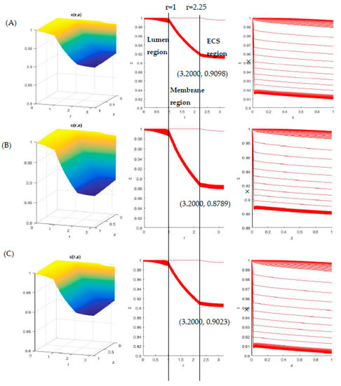 where represents the limit near lumen-membrane boundary in the lumen side (); represents the limit near lumen-membrane boundary in the membrane side . In the membrane region, due to the semi-permeability of membrane and the glucose concentration difference, glucose transport is only governed by diffusion process across membrane (Equations (8) and (9)).