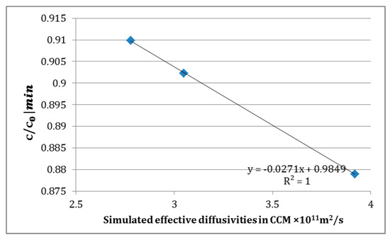 The minimum value of concentration was found near the outlet of the system (z = 1, r = R = 3.2), which is marked with the value in Figure 11. The relationship with the simulated effective diffusivities is shown in Figure 12. Although the main diffusion process occurs in the membrane region, the choice of membranes (i.e., their pore morphologies) affects the minimum glucose concentration in the HFMB. The minimum glucose concentration near the outlet of HFMB is inversely proportional to the simulated effective diffusivities in CCM. In other words, due to the same inlet concentration, the glucose consumption efficiency is improved with increasing diffusivity. However, the cell density is highly nutrient concentration dependent. In order to culture the higher density of cells, the suitability of the chosen scaffold is critical, which should be considered in the HFMB design.