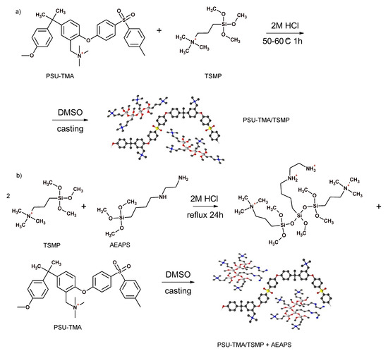 One of the most promising approaches to improve the properties of ion exchange polymers is the formation of organic-inorganic composite membranes [14,15,16,17,18,19]. These hybrid materials show a consistent stabilization due to the interactions between the polymer backbone and the inorganic component, including van der Waals forces and ionic interactions, e.g., between quaternary ammonium groups in the polymer or in the organosilica part with sulfone groups or ether oxygens. An extensive inorganic–organic network, possessing a structural flexibility, offers many possibilities to interact with the hydrophilic and hydrophobic part of the matrix, making it possible to change the membrane properties, especially in terms of stability [20,21,22].