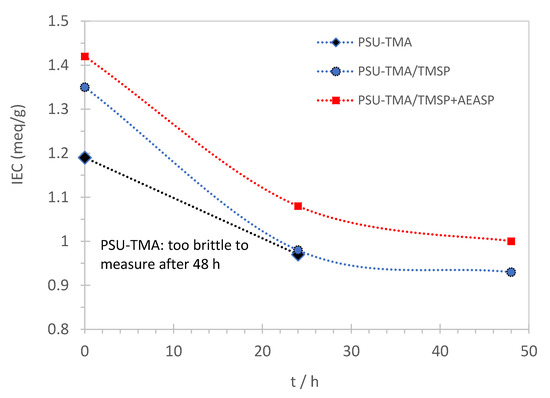 Figure 2 shows the dependence of the IEC on the time of alkaline treatment. The IEC decreases due to the loss of some quaternary ammonium groups. The Hofmann elimination reaction is not observed here, due to the absence of a hydrogen atom in β-position to the quaternary ammonium group. The remaining IEC after 48 h of alkaline degradation is 69% of the initial value for PSU-TMA/TMSP. The membrane containing AEAPS might present a slightly enhanced alkaline stability. The titration of PSU-TMA becomes impossible after 48 h due to brittleness of the membrane showing a strong degradation of the polymer. The increased brittleness indicates a backbone degradation, as expected for polymers containing aromatic ether bonds. The most important function of the hybrid network seems to prevent the brittleness by reduction of chain scissions. This improvement might be attributed either to preferential interactions and/or the reaction of OH− with the hybrid network, which itself contains ammonium groups, or to interactions between the organosilica part and the polymer.