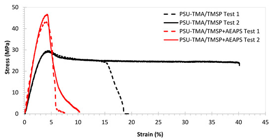 Figure 3 shows typical tensile stress–strain curves recorded for membranes with TMSP and with TMSP and AEASP. The corresponding mechanical properties are reported in Table 1.
