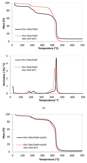 The double peak around 200 °C is attributable to the quaternary ammonium groups of PSU-TMA and the supplementary ammonium and amine groups of TMSP and AEAPS. After alkaline degradation, the second peak in the derivative curve is much smaller or nearly disappears for PSU-TMA/TMSP. It can, therefore, be attributed to the ammonium groups of the TMSP part, because the residue at 700 °C, related to SiO2, is nearly zero after the alkaline treatment (see below). This finding is in accordance with a dissolution of the hybrid network. With TMSP + AEASP, the SiO2 residue remains stable after the alkaline treatment, indicating that AEASP is able to impede the dissolution of the hybrid silica network.