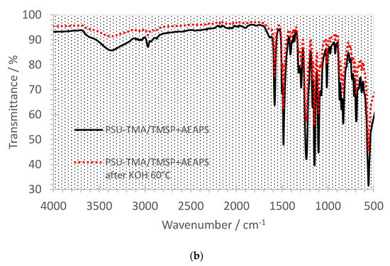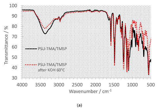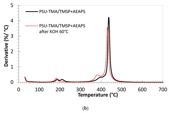 In both samples, one can notice a reduction in the peak related to hydroxide groups around 3400 cm−1, suggesting a decrease in the hydrophilicity due to the loss of some ammonium groups, especially in the case of PSU-TMA/TMSP (Figure 5a). For this sample, one notices an intensity reduction after alkaline treatment of peaks below 1290 cm−1, related to the hybrid silica network, including Si-bonded alkyl group C-H bending at 1290 cm−1, Si-O-Si asymmetric vibration at 1095 cm−1, Si-OH at 1010 cm−1, Si-O at 910 cm−1, Si-C stretching at 835 cm−1, Si-O-Si symmetric stretching at 690 cm−1, and Si-O rocking mode or Si-O stretching of network defects at 550 cm−1 [36]. This intensity reduction is consistent with the absence of SiO2 at the end of the TGA experiment at 700 °C, indicating that the sol–gel part was dissolved in KOH. In the sample with TMSP + AEASP, the intensity reduction is not observed, which is in agreement with TGA experiments.