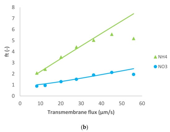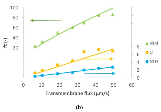 Both the dominant salt and the NH4+ trace were well-rejected as can be seen in Figure 1, their rejections being between 40–80%. On the other hand, NO3− trace rejections were below 50% and it even experienced lightly negative values at small transmembrane fluxes. Negative rejections are due to spontaneously arising transmembrane electric fields induced owing to different membrane permeances for the dominant cations and anions []. In the case of dominant NaCl solution, the membrane is less permeable to Cl− than to Na+ (see Table 1), which is expected given that NF270 is negatively charged. Accordingly, the transport of NO3− is enhanced, leading to negative rejections at small transmembrane fluxes due to the fact that the permeance to NO3− is noticeably higher than that to Cl−. Finally, NO3− rejections turn positive when the electromigration NO3− flux tends to saturation while the permeate gets ever more diluted due to the linear increase in the transmembrane volume.