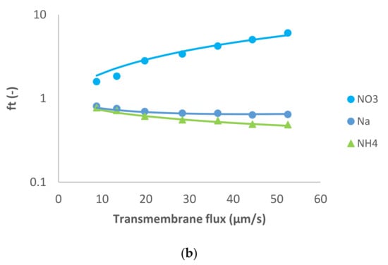 The last case studied is MgSO4 like dominant salt and NH4+, Na+, Cl− and NO3− as trace ions (Figure 4). The dominant salt was highly rejected, as in the previous case, and the trace cations were also rejected. Both trace anions exhibited negative rejections in this case: Cl− was negatively rejected at small transmembrane flux (−70%), but its rejection increased up to 60%, while the values for NO3− were negative in all the range of transmembrane fluxes studied (from −151% to −5%). To fit these more pronounced negative rejections by the model we had to assume noticeably higher ion permeances for the trace single-charge anions than in the case of dominant Na2SO4. Remarkably, the ratio of permeances to NO3− and Cl− for all the studied cases was roughly around 3.