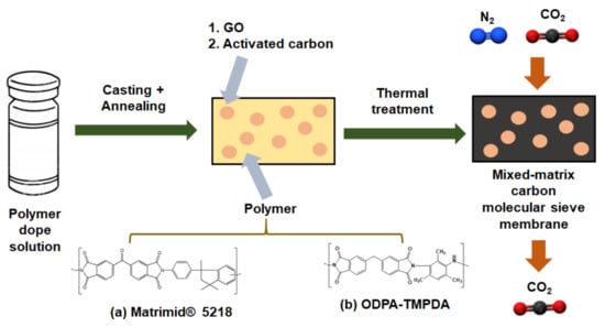 In this study, mixed-matrix CMSMs were fabricated via the incorporation of two different types of carbon-based fillers, which are graphene oxide (GO) and activated carbon (YP-50F) into the polymeric membranes. GO is typically developed from the oxidation of graphene, which is the crystalline allotrope of carbon []. On the other hand, activated carbons do not have well-defined crystallinity as these materials are typically produced by the thermal treatment (carbonization) of carbonaceous precursors, including biomass, coal and polymers []. Subsequently, the polymer matrices used in this work comprised commercial polyimide (Matrimid® 5218) and in-house-produced polyimide (ODPA-TMPDA, where ODPA—4,4′-oxydiphthalic anhydride, and TMPDA—2,4,6-trimethyl-m-phenylenediamine). These polymers were selected due to their reasonably high CO2 permeabilities after being carbonized [,]. Meanwhile, in comparison to high free-volume polymers such as 6FDA-based (6FDA—4,4′-(hexafluoroisopropylidene)diphthalic anhydride) polyimides and PIM-1, Matrimid® 5218 and ODPA-TMPDA polymers are relatively inexpensive and thus can be produced in a scalable manner. It should be noted that high molecular weight ODPA-TMPDA can be readily synthesized without rigorous monomer purifications []. The performance of the synthesized mixed-matrix CMSMs was evaluated by gas permeation tests with a CO2/N2 mixture as the feed gas to the membrane. The performances were benchmarked against the results reported in the literatures and the Robeson upper bound to quantify the enhancement in the gas separation performance.