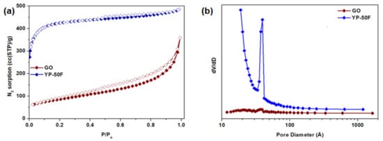 (a) N2 physisorption isotherms and (b) pore size distribution of GO and YP-50F at 77 K.