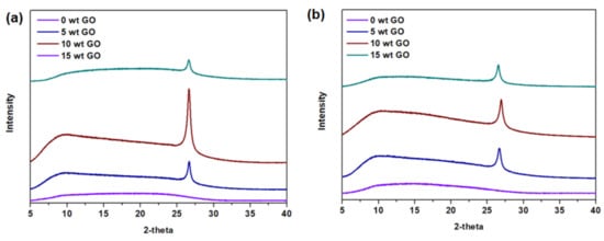 The synthesis of mixed-matrix CMSM was conducted at a pyrolysis temperature of 550 °C. Thus, it was necessary to verify the thermal stability of the studied porous materials. As an initial step, thermogravimetric analysis (TGA) was conducted across the temperature range of 40–800 °C under pure nitrogen purging (Figure S6). Based on the TGA profiles, GO and YP-50F are thermally stable up to approximately 550 °C and 600 °C, which was sufficient for the development of the mixed-matrix CMSMs in this work. It should be noted that several well-reported porous materials, such as MOFs, generally suffer from poor thermal stability (loss of crystallinity at high temperature), making them infeasible for use in this study [,]. The initial decrease in the mass of GO and YP-50F is possibly attributable to the removal of residual water or solvents. The presence of adsorbents remaining after the carbonization process was investigated by the XRD measurement of GO (a crystalline material). In the profile (Figure 6), the characteristic peak of GO at 2θ = 27° can be detected, indicating that the crystallinity was not lost during the carbonization process (by comparing with the XRD pattern in Figure S2). Therefore, systematic increase in the loading of GO and YP-50F (5 wt %, 10 wt % and 15 wt %) was conducted in both the carbonized Matrimid® 5218 and ODPA-TMPDA membranes.