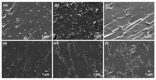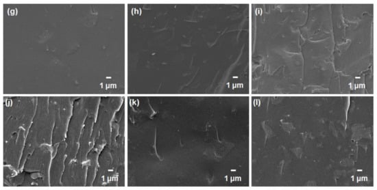 FESEM images of the mixed-matrix carbon molecular sieve membranes containing: (a) 5 wt %; (b) 10 wt % and (c) 15 wt % GO in Matrimid® 5218; (d) 5 wt %; (e) 10 wt % and (f) 15 wt % GO in ODPA-TMPDA; (g) 5 wt %; (h) 10 wt % and (i) 15 wt % YP-50F in Matrimid® 5218; (j) 5 wt %; (k) 10 wt % and (l) 15 wt % YP-50F in ODPA-TMPDA.
