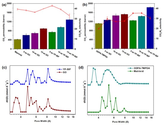 The gas permeation properties of the mixed-matrix CMSMs were measured under 1 bar feed pressure (CO2/N2: 20/80) at 35 °C, and the results are summarized in Figure 8a,b. Based on the gas permeation data, the CMSMs derived from Matrimid® 5218 and ODPA-TMPDA demonstrated an increase in CO2 permeability relative to their precursors reported in the literature []. Such enhancement has been reported in many previous studies, where carbonization increases the fractional free volume of membranes due to thermal rearrangement [,,]. The gas separation performances of the mixed-matrix CMSMs were measured with incremental increases in the loading of GO and YP-50F in the respective membranes. Based on the gas permeation data, all the adsorbents showed substantially greater CO2 permeability than the pure CMSM, with improvement of 110%, 36%, 202% and 64% for 15 wt % GO and 15 wt % YP-50F in carbonized Matrimid® 5218 and carbonized ODPA-TMPDA membranes, respectively. Moreover, none of the mixed-matrix CMSMs suffered from a major loss of CO2/N2 selectivity. The selectivity changes of the CMSMs containing 15 wt % GO and 15 wt % YP-50F in carbonized Matrimid® 5218 and carbonized ODPA-TMPDA, relative to the pure CMSM, were 1%, −16%, 38% and 52%, respectively. Such enhancement can be possibly explained with the aid of micropore size distribution as reported in Figure 8c,d (in which the profiles were calculated from CO2 adsorption at 0 °C as reported in Figure S8). In general, the presence of additional micropores that are smaller than the pores in pure CMSM potentially contributes to an improved CO2/N2 selectivity [,]. Indeed, the presence of the smaller micropores was observed in the pore size distribution of mixed-matrix CMSMs (Figure S9). However, as larger pores (> 8 Å) were also observed in both fillers (YP-50F and GO) and mixed-matrix CMSMs, the capability of YP-50F and GO in improving CO2 permeability can be foreseen. Hence, based on the gas permeation results, it can be expected that the incorporation of carbon-based fillers of high porosity is a feasible method to assist the rapid transport of gas molecules through gas separation membranes, leading to an enhancement in gas permeability.