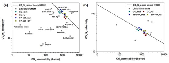 Robeson plot illustrating the performance of the proposed mixed-matrix CMSMs with reference to the literature data for (a) CMSMs [,,,,,,,,,] and (b) mixed-matrix CMSMs [,,] (summarized in Table S3 and S4, respectively).