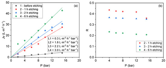 The water flux increased almost linearly with pressure in the range of 0–15 bar; meanwhile, it also increased with the increase of etching time under the same operating pressure (Figure 4a). Under the pressure of 15 bar, the water flux was measured at the range of 27.5–42.8 L·m−2·h−1 depending on the acid etching time of the different membranes, which were all significantly higher than that of the membrane before etching (4.0 L·m−2·h−1). These results suggested an increase in pore size, decreasing skin layer resistance, and enhanced interconnectivity of pores by the increasing etching time.