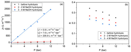 An increase in flux caused by an increase in porosity after a continuous base hydrolysis time was observed in our preliminary experiments, and the suitable hydrolysis time was 6 h. The water flux increased linearly with pressure and increased with the concentrations of the aqueous NaOH under the same pressure (Figure 5a). By hydrolysis with 4 M NaOH aqueous solution, the water flux of the obtained membranes was measured up to 2445.2 L·m−2·h−1 under a pressure of 12 bar. This value is much higher than those of the membranes obtained by hydrolysis with 2 M NaOH solutions and the membranes before base hydrolysis, which gave flux values of 100.9 and 10.7 L·m−2·h−1, respectively. These results indicate that the hydrolysis of crosslinked structures of the polymer and the formation of new pores in the membrane was successfully designed.