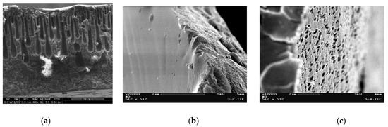 HRSEM images of the cross-section of the membranes produced by Method B using bis-carboxylated polysulfones: (a) before the crosslinking; (b) after crosslinking with a diol. The top of the membrane is on the left side (c) after 6 h of hydrolysis of some of the ester bonds. The top of the membrane is on the right side.