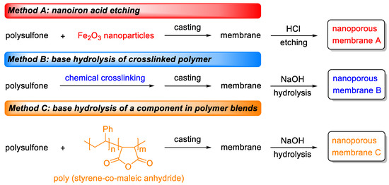 In this contribution, three new techniques for homogeneous pore creation on aromatic polysulfone membranes by the phase-inversion method were developed. As shown in Scheme 1, these routes include (a) the preparation of a polysulfone membrane under the presence of selected Fe2O3 nanoparticles and their dissolution by hydrochloric acid from polymer matrix (Method A); (b) The preparation of a polysulfone membrane through cross-linking between the acid groups of a carboxylated polysulfone with an alkylated diol. Partially cleavage of the cross-linkage motifs with a strong base induces the formation of numerous nanopores with uniform size (Method B); (c) The preparation of a polysulfone membrane through base hydrolysis of anhydride bonds inside the membrane composed from polysulfone and poly (styrene-co-maleic anhydride) blends (Method C). We wish to demonstrate that the nanopore membranes obtained by these methods are promising for water treatment applications with high water flux and reasonable salt rejections.