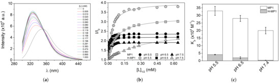 (a) Representative emission spectra of 2 μM MP1 in buffer and the presence of POPC:POPG (7:3) LUVs at the indicated concentration, at pH 5.5 and 25 °C. (b) Binding isotherms of MP1 (black) or H-MP1 (light gray) to 7POPC:3POPG LUVs at pHs 5.5 (circles), 6.5 (squares), and 7.4 (triangles). The solid lines represent the non-linear fit represented in Equation (3). (c) Partition constant (K) obtained from (b). All data correspond to the average (±SD) of three independent experiments.