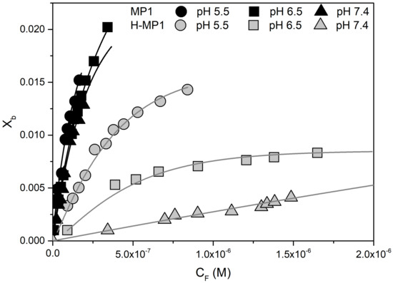 Figure 2 shows X vs. C adsorption isotherms for MP1 and H-MP1 at the three pH, obtained from the fluorescence titrations of these peptides. The continuous lines represent the best theoretical isotherms obtained with GC theory. At pH = 4.7, the average net charge was = 2.96 ± 0.15 for both peptides and the intrinsic constant K = 1000 ± 50 M for MP1 and K = 200 ± 20 for H-MP1. At pH = 6.6, the GC analysis for H-MP1 titration showed that = 1.516 ± 0.006. Throughout the whole titration, the surface potential increased only 0.3, indicating negligible H-MP1 adsorption. Considering bulk pH values, MP1 at acidic solution, the average peptide net charge was = 2.30 ± 0.05 and an intrinsic adsorption constant of K = 2600 ± 100. For the analog, a constant five times lower (K = 590 ± 50) was obtained using a similar average H-MP1 net charge = 2.24). As expected, MP1 adsorbed onto the anionic bilayer, at neutral pH, with the same intrinsic constant considering a similar average net charge (z = 1.95). In this condition, the highest fraction of absorbed H-MP1 with z = 0.28 only reached X = 0.0044, while the surface potential only increased 0.3 mV, indicating negligible adsorption.