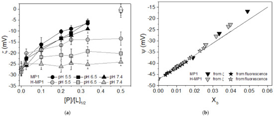 Figure 3a shows the 7POPC:3POPG vesicle zeta potential () in the presence of different peptide-to-lipid molar ratios ([P]/[L], considering the outer lipid leaflet) at pHs 5.5, 6.5, and 7.4 for both peptides. For MP1 and at the three analyzed pHs, the zeta potential increased non-linearly with the [P]/[L] ratios achieving the potential inversion signal at approximately the same [P]/[L] ratios. These results were in good agreement with the GC analysis of the fluorescence titrations, indicating that the peptide adsorption constant and the peptide net charges were roughly similar. The zeta potential of H-MP1 at pH 5.5 and 6.5 increased smoothly and non-linearly with [P]/[L]. At neutral pH, the zeta potential hardly changed within the same [P]/[L] range, indicating very weak adsorption of H-MP1. This result matched with the lytic activity observed in LUVs ([39]). In this sense, the electrostatic attraction played an important role in peptide/membrane interaction. In the same range of peptide concentration in which MP1 neutralized the vesicle charge, H-MP1 only induced roughly a 50% increase of the zeta potential. For MP1, this value was, however, avoided considering the slight increase of the average vesicle diameter (Figure S1), suggesting a small amount of vesicle aggregation despite the monomodal distribution of vesicle sizes.