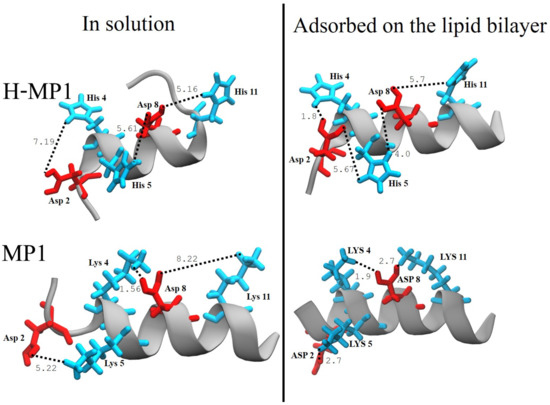 Arrangement of the titratable residues in MP1 and its analog in solution and adsorbed on the lipid bilayer. The distances show the salt bridges’ network. The backbone is shown as a cartoon in gray. The side chains are shown in black, the acidic in red, and the basic in cyan. Distances are measured in angstroms. The radial distribution function g(r) of the residues pair Lys-Asp for MP1 and His-Asp for H-MP1 are shown in Figure S4.