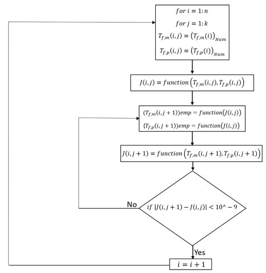 As shown in Figure 2, the feed and permeate channels are divided into n elements, and the Navier-Stokes, continuity, and heat transfer equations are solved by employing Fluent ANSYS. As the heat along the feed channel transfers to the permeate side, the bulk feed temperature along the membrane decreases, whereas the permeate temperature increases. The obtained bulk temperatures enable us to calculate downstream flow properties and membrane temperatures on both sides. Since the equations to compute membrane temperature on both sides in the semi-empirical model are dependent on water flux, and to include the effects of water flux on the temperature results on the numerical model, the algorithm illustrated in Figure 3 has been applied to couple the temperature results of numerical simulation with the empirical model for each element.