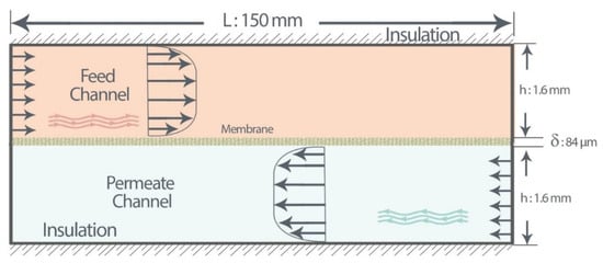Schematic of flow configuration, counter-current operation, as a baseline for DCMD system. L, length of the channels; h, height of the feed and permeate channel; , membrane thickness.