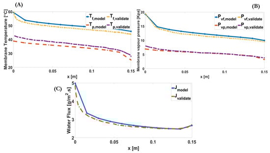 (A) Downstream alterations of feed and permeate membrane temperatures validated by the reference model [21]. (B) Downstream alterations of the membrane water vapour pressures of the feed and permeate validated by the reference model [21]. (C) Downstream alterations of the transmembrane mass flux validated by the reference model (less than 7% deviation) [21].