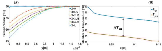 As illustrated in Figure 6A, cross-sectional temperature profiles along the feed channel have been used to show the temperature distribution in each feed side section. It is illustrated that the thermal boundary layer increases and expands along the module; therefore, the heat transfers gradually across the channels on both sides (feed and permeate). Figure 6B shows the decrease in membrane feed temperature in its downstream direction, especially close to the channel inlet, and the increase in membrane permeate temperature in the upstream direction. It also shows that the temperature difference, as the main driving force, becomes almost unchanged after the feed and permeate channel inlets. In conclusion, the results illustrate that contrary to one-dimensional conventional model, temperature profiles in each section and membrane temperatures at both sides (feed and permeate) change significantly along the module.