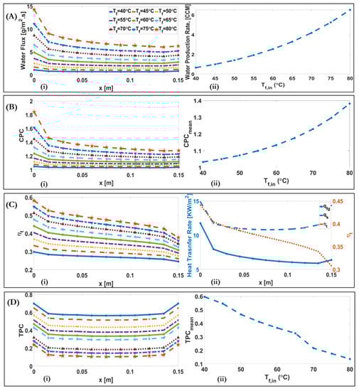 (A) (i) Downstream alterations of water flux for different inlet feed temperatures of a DCMD system. (A) (ii). Alteration of water production rate with varying inlet feed temperatures of a DCMD system; (B) (i) Downstream alterations of CPC for different inlet feed temperatures of a DCMD system. (B) (ii) Alteration of maximum CPC with varying inlet feed temperatures of a DCMD system; (C) (i) Downstream alterations of for different inlet feed temperatures of a DCMD system. (C) (ii) Conduction heat transfer (), phase change (), and thermal efficiency () of a DCMD system for the baseline condition; (D) (i) Downstream alteration of TPC for different inlet feed temperatures of a DCMD system, (D) (ii) Alteration of mean value of TPC with varying inlet feed temperatures.