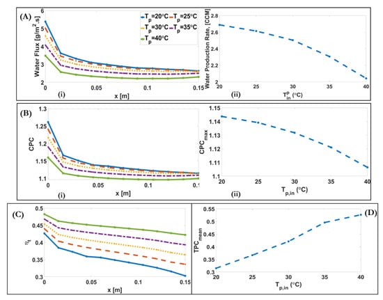 (A) (i) Downstream alterations of water flux for different inlet permeate temperature of a DCMD system; (A) (ii) Alteration of water production rate with varying inlet permeates temperatures of a DCMD system. (B) (i) Downstream alterations of CPC for different inlet permeate temperatures of a DCMD system; (B) (ii) Alteration of maximum CPC with varying inlet permeate temperatures of a DCMD system. (C) Downstream alteration of for different inlet permeate temperatures of a DCMD system. (D) Alteration of mean value of TPC with varying inlet permeate temperatures.