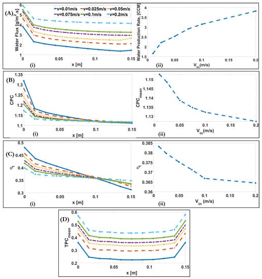 (A) (i) Downstream alterations of water flux for different inlet velocities of a DCMD system; (A) (ii) Alteration of water production rate with varying inlet velocities of a DCMD system. (B) (i) Downstream alterations of CPC for different inlet velocities of a DCMD system; (B) (ii) Alteration of maximum CPC with varying inlet velocities of a DCMD system. (C) (i) Downstream alteration of for different inlet velocities of a DCMD system; (C) (ii) Alteration of mean with varying inlet velocities of a DCMD system. (D) Downstream alteration of TPC for different inlet velocities of a DCMD system.