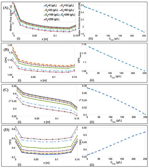 Figure 10A(i)–D(i) show the downstream alterations of water flux, CPC, thermal efficiency, and TPC for different feed concentrations. The decrease in water flux with increase of occurs due to a decrease in vapour pressure difference. This is because the water vapour pressure is dependent on the minus quadratic function of molality. The water production rate decreases from 2.56 CCM for to 1.85 for . Besides, as the convective mass transfer coefficient remains constant with the increase of , the decrease of leads to a decrease in CPC from 1.134 for to 1.08 for , Figure 10B. The decrease in thermal efficiency occurs from 0.37 for to 0.3 for , due to the decrease in , which occurs due to the decrease in . It was also shown that TPC increases with , from 0.36 for to 0.52 for . This occurs because the heat transfer occurs with the combination of phase change and conduction heat transfers, which depend on and membrane temperature difference, , respectively. With the same bulk temperature difference, , the conduction heat transfer part is dominant, due to the decreased water flux and phase change transfer. Therefore, membrane temperature difference, , and TPC increases.