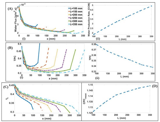 As shown, with the increase of channel length, water flux increases 2.7-fold from 1.82 for 100 to 4.9 for 350 because the longer channel provides more contact surface to exchange heat between feed and permeate channels; however, water flux decreases at the fixed , as shown in Figure 11A(i). Due to the decrease of mean membrane temperature difference along the channel, the mean TPC decreases from 0.38 for to 0.34 for as the channel length increases from 100 to 350 , Figure 11B(ii). As shown in Figure 11B(i), when the channel length increases, the U-shaped TPC becomes widened. This is because the longer channels provide more heat exchange along the module. Therefore, at the fixed the TPC of the shorter channel is higher than the longer one. Figure 11C,D show that thermal efficiency and CPC increase by 8% and 2%, respectively, as the channel length increases from 100 to 350 .