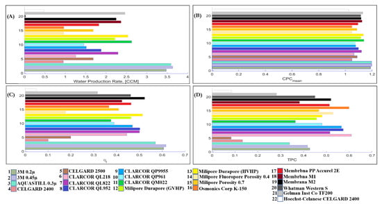 (A) Water production rate, (B) Maximum of CPC, (C) Thermal efficiency , and (D) TPC for the 22 commercially available membranes listed in Table 2.