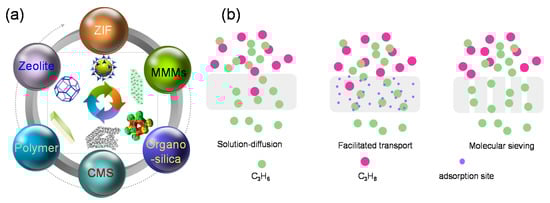 Figure 1. (a) Overview of the various membrane materials for C3H6/C3H8 separation. (b) General permeation mechanisms for C3H6/C3H8 separation through membranes.