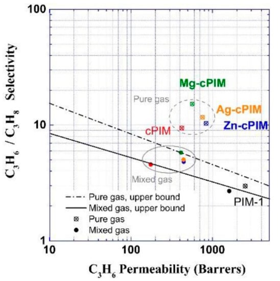 Liao et al. explored C3H6/C3H8 separation behaviors by incorporating metal ions such as Zn2+, Mg2+, and Ag+ into PIMs [22]. Zn2+ increased the membrane permeabilities by enlarging the free volume of the matrix, while the affinity between the membranes and C3H6 molecules was enhanced after modification with Mg2+. The Ag+-functionalized PIMs resulted in a facilitated transport mechanism for the permeation of C3H6. In short, metal-ion-incorporated PIM membranes showed higher C3H6/C3H8 selectivities than those of pristine PIM membranes. The specific data for pristine and metal-modified PIM membranes for C3H6/C3H8 separation are shown in Figure 2. Kasahara et al. also reported facilitated transport in an ion-gel membrane with a high permeability of C3H6, which was attributed to the addition of silver ions [23]. However, the stability of facilitated transport membranes in C3H6/C3H8 separation requires further improvement. Jose et al. found that the C3H6/C3H8 selectivity of Ag-doped polymer membranes continuously decreased with the operation time due to the reduction of Ag+ during the reaction [24]. The agglomeration of Ag may lead to the appearance of defects, which is detrimental to the membrane separation performance.