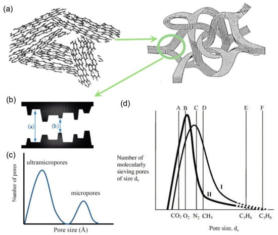 Figure 3. (a) Structure of pyrolytic carbon material [51]. (b) Schematic image of the “slit-like” structure and (c) the bimodal pore size distribution [49]. (d) Hypothetical semi-quantitative ultramicropore size distribution of CMS membrane [31].