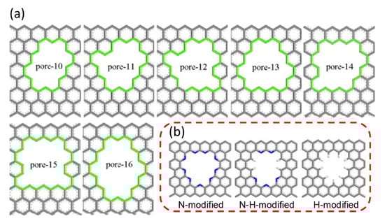 Figure 5. (a) Structure of porous graphene models. (b) Structure of the modified pore-13 [61].