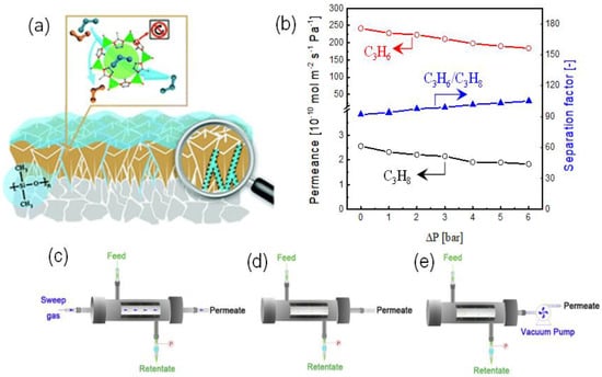 Figure 7. (a) Schematic illustration of the PDMS-coated ZIF-8 membrane [74]. (b) Separation properties of C3H6/C3H8 as a function of the transmembrane pressure [74]. Permeation conditions for C3H6/C3H8 separation (c) with sweep gas, (d) without sweep gas, and (e) with vacuum pump [75].
