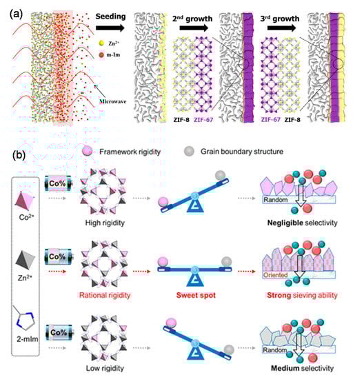 Figure 8. (a) Schematic illustration of the membrane synthesis via heteroepitaxial growth [76]. (b) Schematic illustration of the design of bimetallic Zn(100-x)CoxZIF membranes [68].