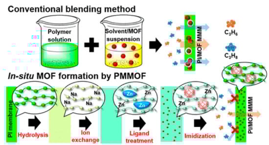 Most of the reported MMMs are synthesized by mixing two individual phases (a dispersed phase and a continuous phase). However, the critical conditions must be controlled to suppress the possible generation of interfacial voids. Recently, the concept of in-situ growth of MOFs in a polymer matrix was proposed for the fabrication of MMMs for gas separation [78,79,80]. As revealed in Figure 9, four steps are required: polymer hydrolysis, ion exchange, ligand treatment, and imidization for the in situ formation of MMMs [77]. The in situ growth method potentially eliminates the formation of interfacial voids and enhances the dispersity of inorganic fillers in the polymer matrix. In addition, the resultant novel MMMs showed much higher C3H6/C3H8 selectivities than that of the conventional MMMs. The authors also demonstrated the possible scalability of the MMMs derived by the in situ growth method using commercial hollow fiber membranes, which also exhibited acceptable C3H6/C3H8 separation properties (C3H6 permeance: 2.17 GPU, C3H6/C3H8 selectivity: ~20).