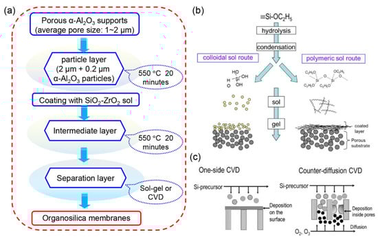 Figure 10. (a) Schematic illustration of the detailed fabrication process of organosilica membranes. (b) Sol–gel process for the formation of a separation layer including polymeric and colloidal sol routes [81]. (c) One-sided chemical vapor deposition (CVD) and counter-diffusion CVD methods for the deposition of an organosilica layer [81].