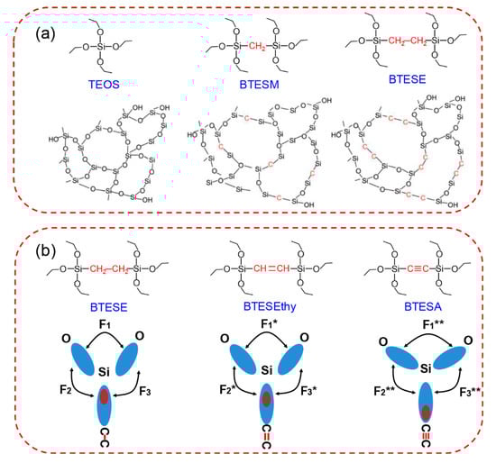 Figure 12. (a) Schematic illustration of amorphous network structures derived from tetraethoxysilane (TEOS), bis(triethoxysilyl)methane (BTESM), and bis(triethoxysilyl)ethane (BTESE) [89]. (b) Bonding structure model of BTESE-, BTESEthy-, and BTESA-derived networks [93].