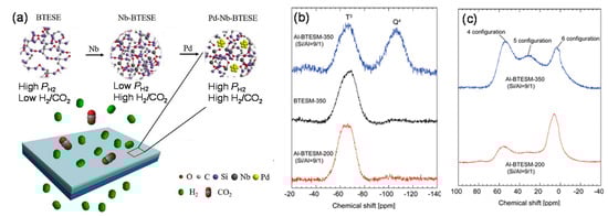 Figure 13. (a) Schematic image of the possible structures of Pd–Nb–BTESE networks for H2/CO2 separation [114]. (b) 29Si and (c) 27Al magic-angle spinning nuclear magnetic resonance (MAS NMR) spectra for BTESM and Al-BTESM gel powders [100].