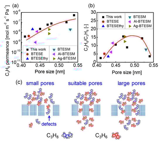 Figure 14. Relationships between pore size and single gas permeation properties: (a) C3H6 permeance and (b) C3H6/C3H8 permeance ratio at 200 °C for a variety of (composite) organosilica membranes. (c) Possible schematic image for C3H6/C3H8 separation utilizing organosilica membranes with different pore sizes [101].