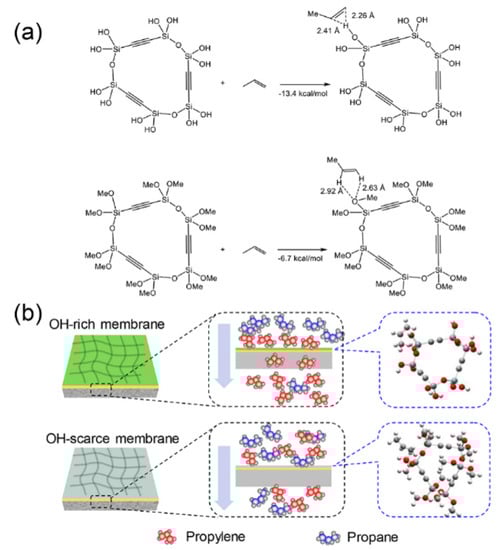 Figure 15. (a) Model reactions cyclic trimers and optimized geometries of propylene complexes. (b) Plausible C3H6/C3H8 separation mechanisms through BTESA membranes with different chemical properties [45].