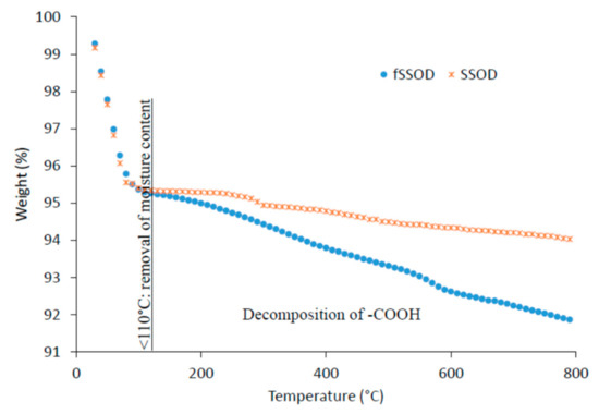 Thermal stability of the as-produced nanoparticles was examined by the thermo gravimetric analyser (TGA) as shown in Figure 4. A 5% reduction in weight of the nanoparticles in the region <100 °C can be associated with removal of content water in the sodalite. Above this temperature, there is a further 1.4% weight loss for SSOD associated with the decomposition of interlayer propionic acid in the SSOD particles [27]. The 3.54% weight loss above 100 °C in fSSOD is associated with the decomposition of the -COOH functional group [36,37]. The increased weight loss for fSSOD is a confirmation of the presence of additional functional groups [30]. These observations are also reported in the literature [28,30]. These results show that the as-produced nanoparticles are stable at higher temperatures as there is very little weight loss.