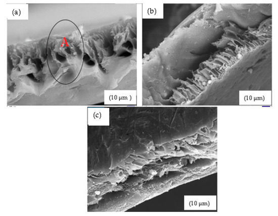 Figure 6a shows the 10% SSOD/Psf membrane with an area marked A showing agglomeration of nanoparticles on the cross sectional area of the membranes. This has been shown to limit membrane performance due to the increased free void volume [38]. The 10% fSSOD/Psf membrane in Figure 6b shows an improved distribution of nanoparticles on the membrane surface. This can be attributed to the functionalization of nanoparticles that have been proven to improve the dispersion of nanoparticles on polymer matrix and hence improve membrane performance [37]. There is no visible separate layers on the 10% fSSOD/Psf/PVA membrane as shown in Figure 6c. This shows that there was a good bond formation between the Psf and PVA layers. The results obtained in this study are consistent with what was obtained in the literature [38,39].
