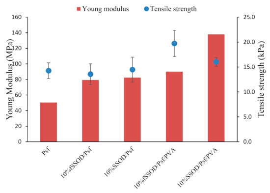 Mechanical strength of the fabricated membranes is depicted in Figure 7. It can be observed that infusing nanoparticles on the polymer matrix improves the membrane’s Young Modulus from 50 MPa for Psf to 79 MPa and 82 MPa for 10% fSSOD/Psf and 10% SSOD/Psf, respectively. A maximum Young Modulus of 138 MPa in 10% SSOD/Psf/PVA and tensile strength of 19.7 kPa in 10% fSSOD/Psf/PVA was obtained after the membranes were coated with PVA.