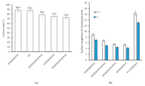 (a) Contact angle and (b) surface roughness of the fabricated membranes.