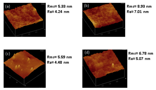 AFM images of: (a) 10% SSOD/Psf, (b) 10% fSSOD/Psf, (c) 10% SSOD/Psf/PVA, and (d) 10% fSSOD/Psf/PVA evaluated at an area of 2 × 2 µm2.